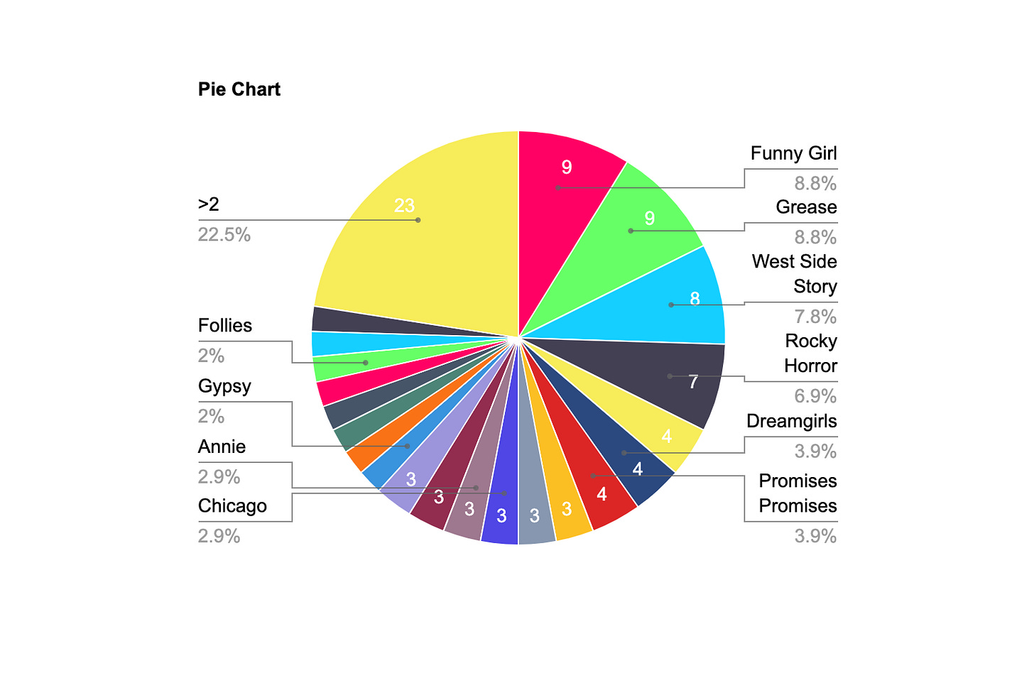 There’s so much going on in any five minutes of Glee that I expect we’ll be excavating its mysteries for centuries, to come as it's a sort of cryptograph of Obama’s America (stay with me). One fact that explains a lot is the show didn’t have a writer's room for the first couple seasons. The three creators- Ryan Murphy, Brad Falchuk, and Ian Brennan- wrote the scripts mostly independently. If you look at the pie chart below, you’ll see their tastes run fairly mainstream where showtunes are concerned. Realistically, Rachel and Kurt would definitely be well-versed in these shows, but what they actually listened to would probably be much more contemporary and less well-trod territory, especially when it came to auditions and competitions. Ask the 2018 Jimmy Awards winners- you want a selection that is not in everybody’s songbook!