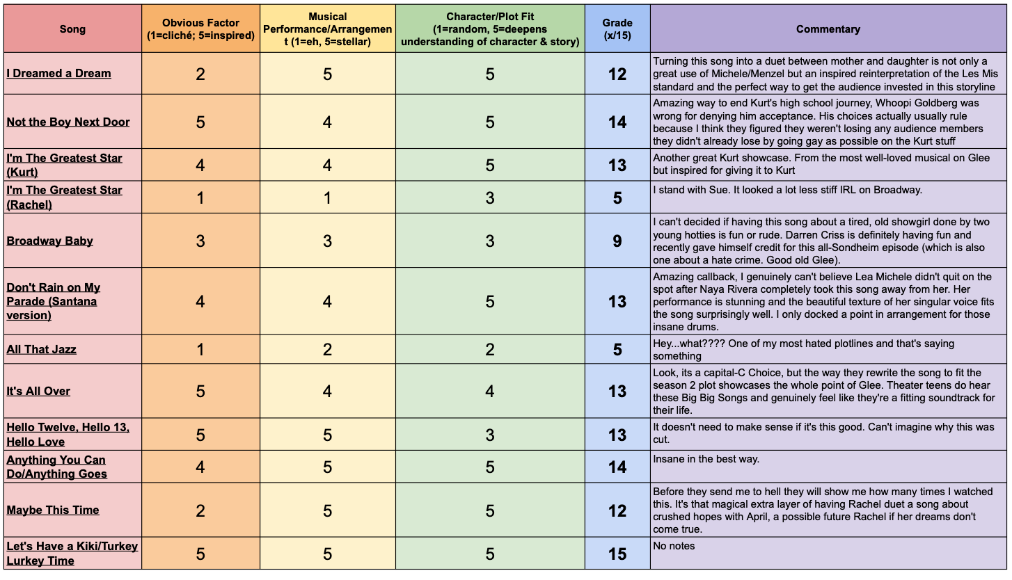For a show that defined itself as being written for theater nerds, its tastes are just so pedestrian. Like the real Rachel Berry in 2009 would be trying to convince her classmates she was deep by belting Next to Normal solos, and I bet Artie really wanted to white boy rap to Lin Manuel Miranda’s parts in In the Heights. There were lonely teenagers camped on Ryan Murphy’s lawn DEMANDING we get a Spring Awakening song. Don’t tell me it would’ve been too meta when we had that much Wicked going on! Maybe writers pitched lesser known musicals but Roberto Aguirre-Sacasa shot them all down so he could use those ideas later in Riverdale. Also as time went on, I know what would sell on iTunes had a lot more to do with the choices. Or could it be that the ravenous desires of lonely teenagers devoted to a niche art form somehow didn’t sync up with a mainstream network sitcom audience…NAH!